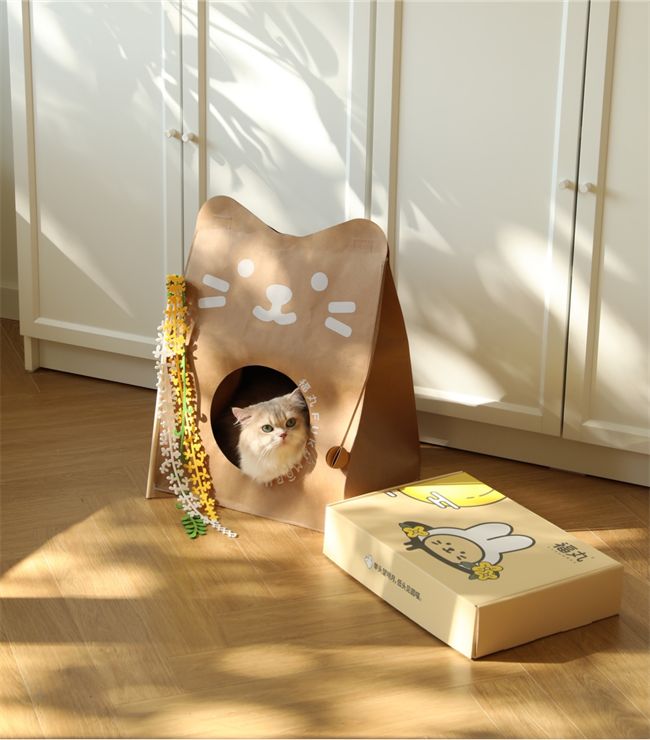 福丸今年推出的新品纸袋猫窝选材上将传统的瓦楞纸和水洗牛皮纸材质进行结合,顾客在日常使用中可以将底部的瓦楞纸板取出,猫窝+抓板二合一的设计,也避免了猫咪抓挠掉屑而出现的每日清洁地面烦恼。