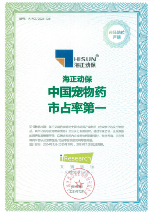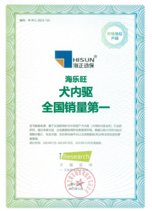 近日,艾瑞咨询发布市场地位确认,授予海正动保“中国宠物药市占率第一”称号,并对其旗下产品海乐旺(米尔贝肟吡喹酮咀嚼片)颁发“犬内驱全国销量第一”权威认证。