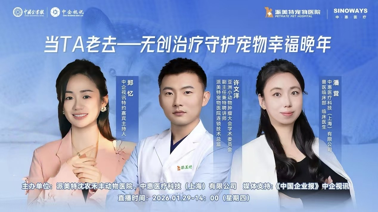 1月29日,中惠医疗科技(上海)有限公司(以下简称“中惠医疗”)联合派美特宠物医院沈农禾丰动物医院,举办主题为“当TA老去——无创治疗守护宠物幸福晚年”的公益直播。此次直播聚焦宠物肿瘤防治、无创治疗技术普及及老年宠物科学养护,邀请派美特宠物医院连锁技术总监许文洋医生、中惠医疗兽医师潘营医生担任主讲嘉宾,结合临床案例与前沿技术,为全国宠物家长带来专业科普,旨在普及知识、缓解养宠焦虑、推动行业升级。