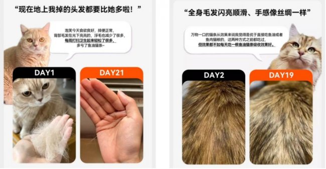 品牌发起的私域活动“21天亮毛计划”累计覆盖142位真实用户,打卡数据显示:81%的猫咪毛发更亮、83%掉毛减少、95%排便通畅,用户自发反馈“优于直接喂鱼油或鱼肉粮”。
