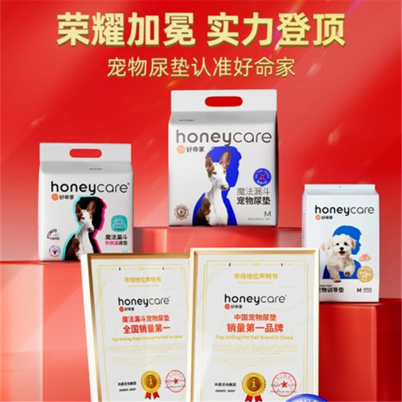 honeycare好命家荣获【honeycare好命家 魔法漏斗宠物尿垫全国销量第一】【honeycare好命家 中国宠物尿垫销量第一品牌】两项市场地位声明,标志着其在宠物卫生用品行业的标杆地位及消费...